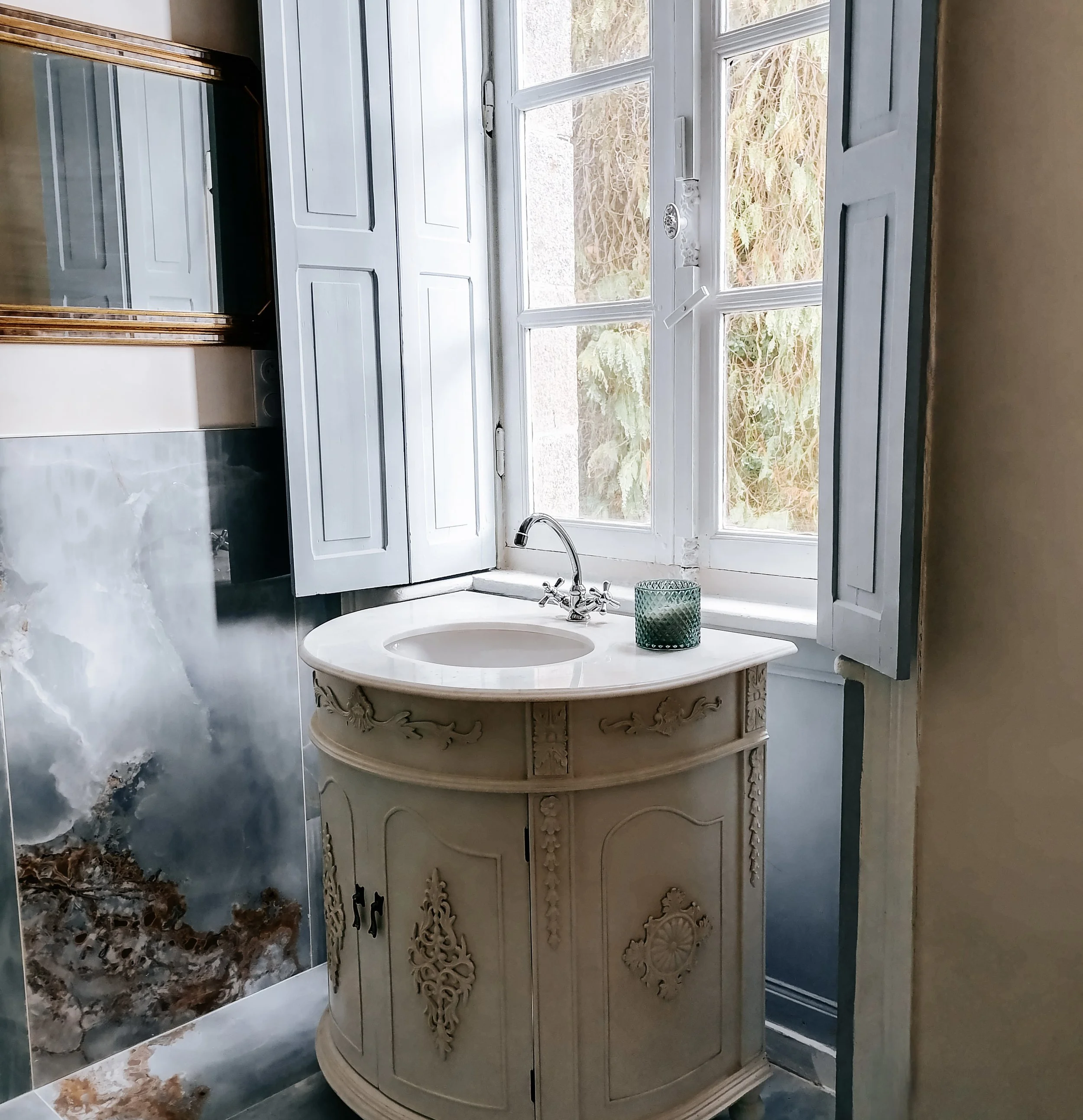 The Sage room is the largest of the three guest rooms. It is located on the first floor, at the top of the carved wooden staircase. The sage room is set in what was once the sumptuous dining room, with generous proportions, a high beamed ceiling, ornate stone fireplace and detailed wood panelling.